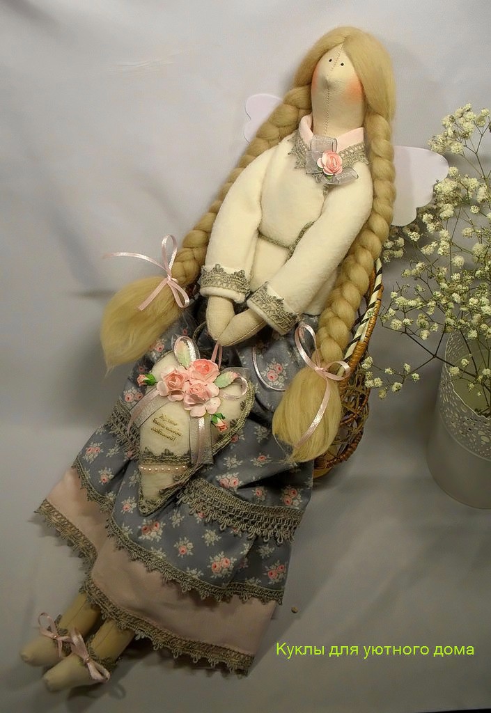 Наряд феи выполнен из натуральных материалов: жакетик - флис, юбочка из ткани Tilda в сочетании со льном и хб кружевом. Сердечко выполнено из флиса, слегка ароматизировано ванилью. Волосы из нат.шерти. Рост 52 см. Сзади съемные крылышки и петелька-подвес.